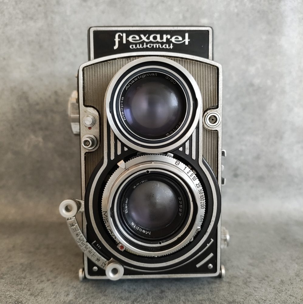 Flexaret VIは中判6×6判の二眼レフで120ロールフィルムを標準とする。専用アダプターを用いれば35mmフィルム撮影にも対応する設計で同時期の競合機に比べても拡張性が高い。撮影レンズはMeopta Belar 80mm F3.5、ピント用レンズはMeopta Anastigmat 80mm F3.0を基本とし、描写の安定性と操作レスポンスの良さを両立している。シャッターは主にMetaxが採用され、個体によっては別仕様が存在する。