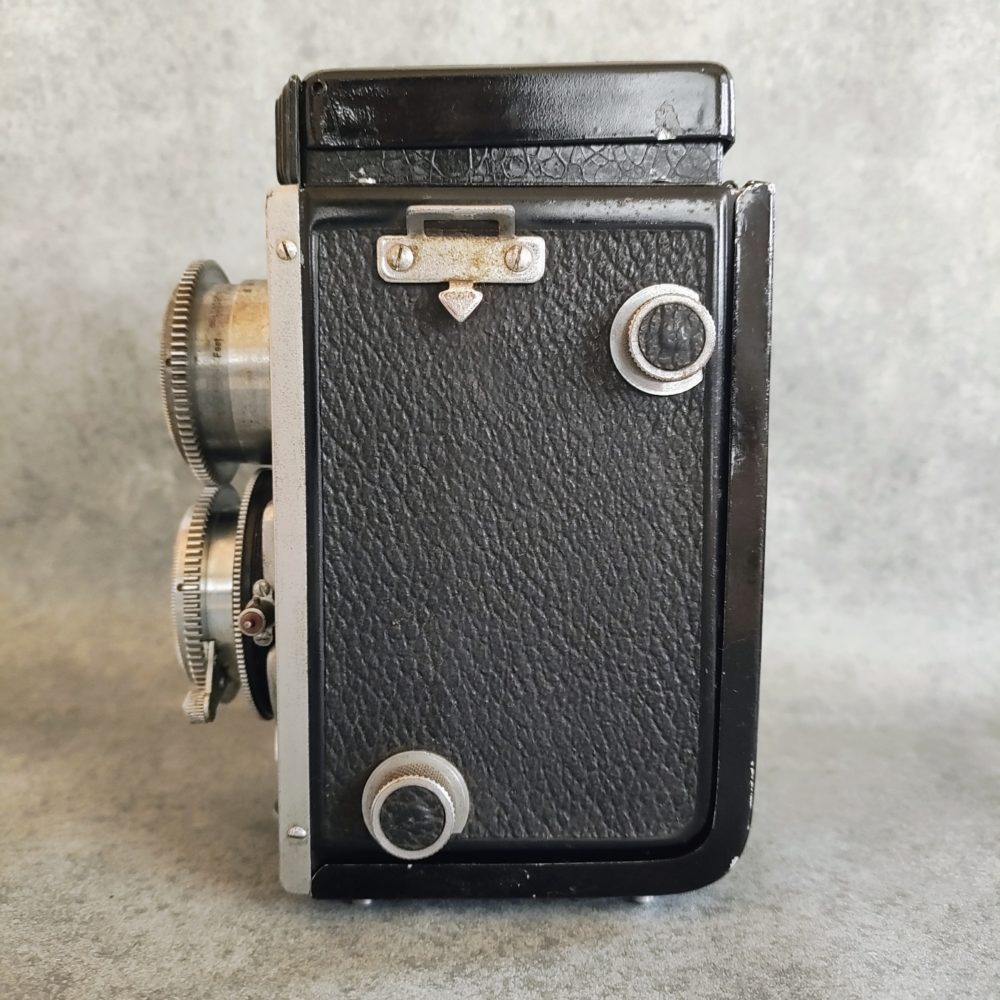 東郷堂は戦前から活動したメーカーで戦後は再編を経て二眼レフを中心とする普及機を多数供給した。HOBIFLEXはそのなかでも早期の6×6TLR系譜に属し、Toyocaflexへと連なる開発の橋渡し的な位置づけにある。IV型の登場時期は1950年代前半と見られ、当時の国産TLR群が急速に多様化していく潮流のなかで堅実なスペックと入手性を備えたモデルとして存在感を示した。市場資料ではIV型のシャッター最高速が1/150秒で記録されており、世代識別の基準として広く参照されている。