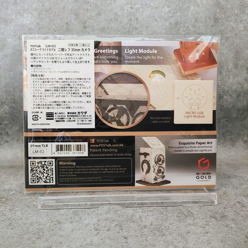 POSTalk(ポストーク)は精緻なカッティングと立体構造で平面の紙を造形物へ転換する発想を核に据えるブランドである。本商品は二眼レフをモチーフにし、紙素材の層と開口部の配置で角張った筐体やツインレンズの表情を再現している。また本品は装飾用のペーパークラフトであり、玩具ではないことが強調されている。