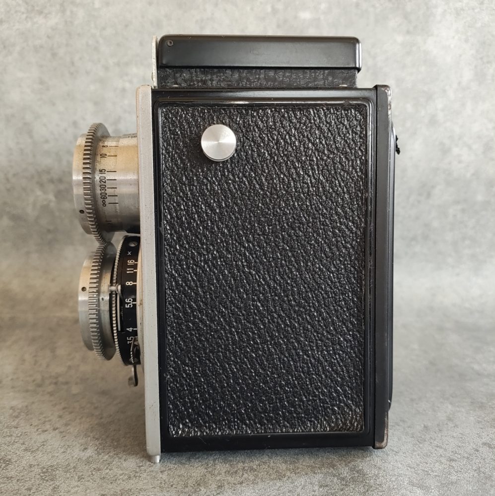 前玉連動式のフォーカシングは軽快でウエストレベルのスクリーン上でもピントの山がつかみやすい部類である。80mm F3.5のアナスチグマットは三枚玉らしいコントラストと中心部の素直な解像を示し、絞れば周辺の収差が安定する。シャッターは標準仕様で1/200秒まで、一部個体は1/400秒まで使えるため感度100程度のフィルムでも日中の露出設計がしやすい。