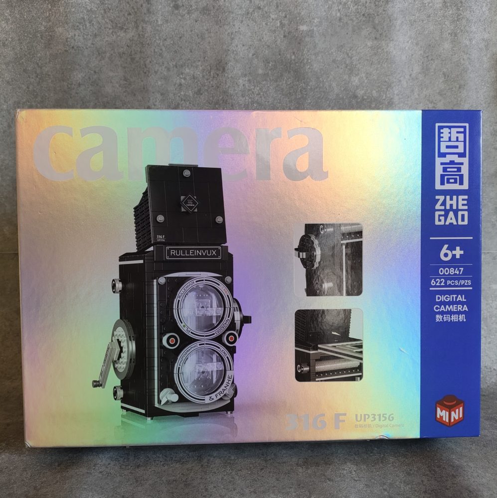 “ZHEGAO RULLEINVUX” is a display model that recreates a twin-lens reflex camera using mini blocks. Made of 622 pieces, it builds to roughly 16 × 14 × 19 cm, striking a solid balance between ease of assembly and visual presence. The detailing of the lenses and hood stands out, but note the tiny parts and the possible variation in whether printed tiles are included.